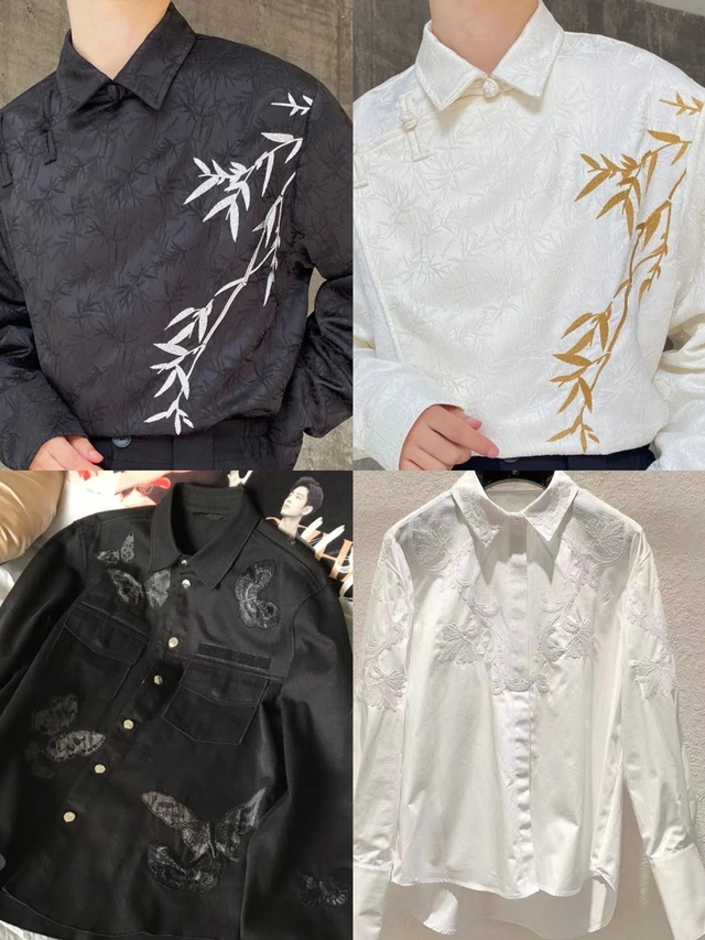 张杰(张晓杰)(介绍衬衣)大家看,这四款衬衫各具特色,尽显品味同样这四件衬衫都是有名字的 1. **墨夜银竹**:黑色为底,银色竹叶刺绣点缀其间,简约而不失高雅,适合追求内敛奢华感的男士。 2. **雪素金竹**:白色基调上,金色竹叶刺绣轻盈跃动,如月光洒落,清新脱俗,适合喜爱简洁风格的人士。 3. **暗夜蝶舞**:全黑牛仔外套搭配精致的蝴蝶图案,硬朗与柔美并存,展现独特的个性魅力,适合追求时尚感的潮流男士。 4. **蕾丝白羽**:纯白色衬衫,领口及袖口处以细腻的蕾丝雕花装饰,优雅中透露着一丝甜美,是日常穿搭的理想选择。