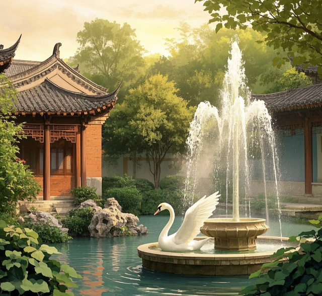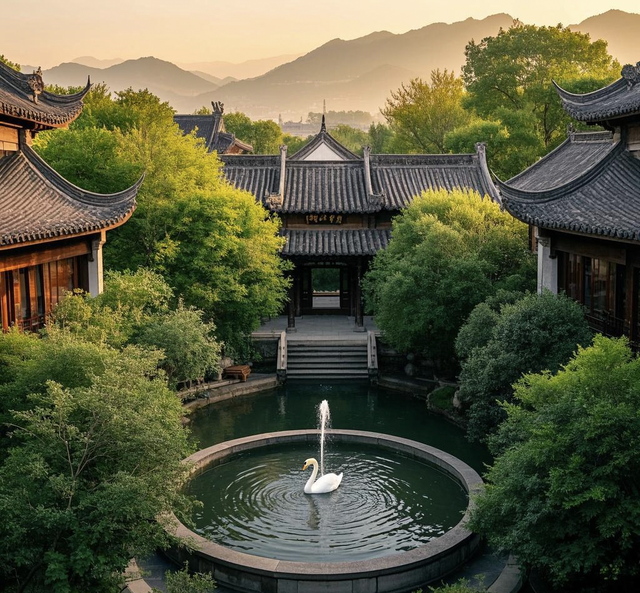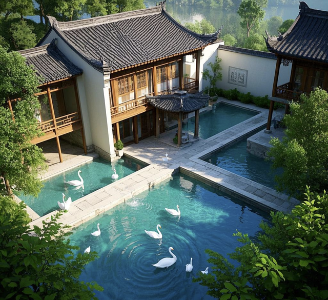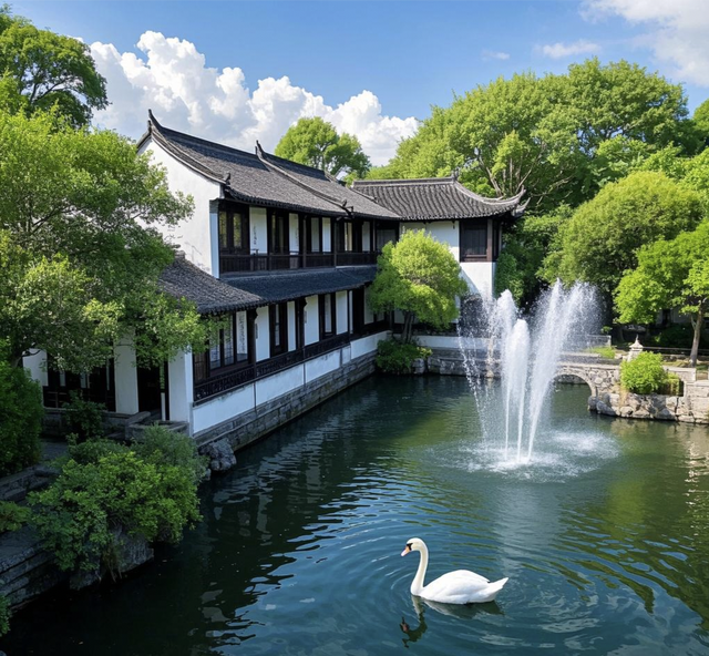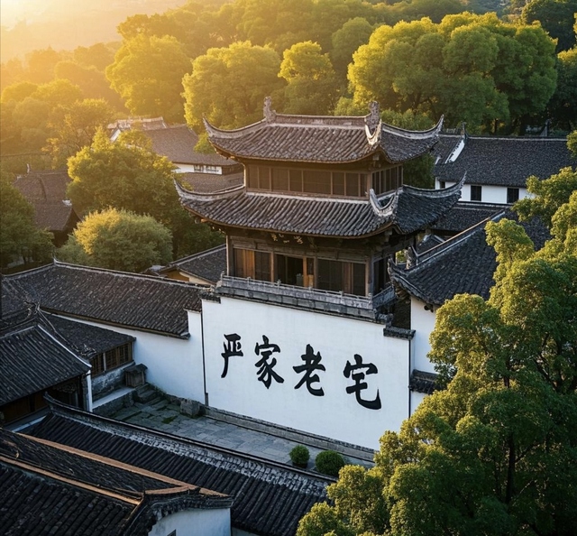 站在严家老宅前,那飞檐翘角如欲展翅高飞的大鹏,灵动而不失庄重,仿佛在诉说着岁月的故事。这独特的中式设计不仅巧妙地引导着雨水顺畅流淌,更赋予了整座宅邸灵动的生命力。步入其间,木质框架结构撑起了这座百年老宅的灵魂。粗壮的木柱稳稳伫立,承载着历史的重量;横梁交错间,散发着淡淡的檀香气息。这种传统工艺所特有的韧性,不仅抵御了无数次风雨侵袭,更见证了一代又一代家族成员的成长变迁。目光所及之处,白色墙体与黛瓦屋顶相互映衬,宛如一幅水墨画卷。简洁而纯粹的色彩搭配,既体现了主人对自然质朴之美的追求,也暗示着居住者内心深处那份淡泊宁静的情怀。门窗上的雕花、栏杆间的精致纹饰,无不凝聚着手艺人的心血。每一处雕刻都仿佛在低语着往昔的故事,让来访者不禁驻足凝望,沉浸在这份跨越时空的艺术之美中。庭院深深,水榭亭台错落有致。池塘倒映着天光云影,绿植环绕四周,营造出一片静谧天地。这里的一草一木,一砖一瓦,皆遵循着“天人合一”的哲学思想,和谐共生。漫步其中,仿若置身于世外桃源,心灵也随之得到了净化与升华。