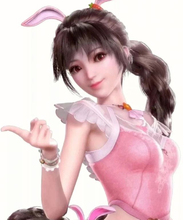 他左手边的少女,一头黑色长发扎成蝎子辫,直垂到小腿,头上有一对毛茸茸粉色的兔耳朵。精致的五官尤为突出,身穿粉色上衣和粉色短裙,露出白皙盈盈一握的细腰。一双大长腿被粉色长筒袜包裹着,脚上则是一双粉色的粗跟高跟鞋。