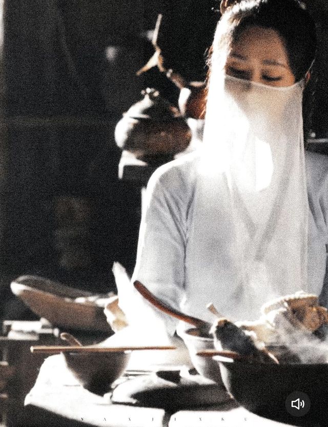 “青瑶拿起筷子挑了一个最小的鸡肉然后背对着应渊隔着面纱吃了起来。”