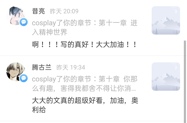 作者母亲谢谢回韵宁,尹静美,深夜无限天,昔亮,腾古兰,田昌勋的cosplay你们是我写作路上的动力源!感谢