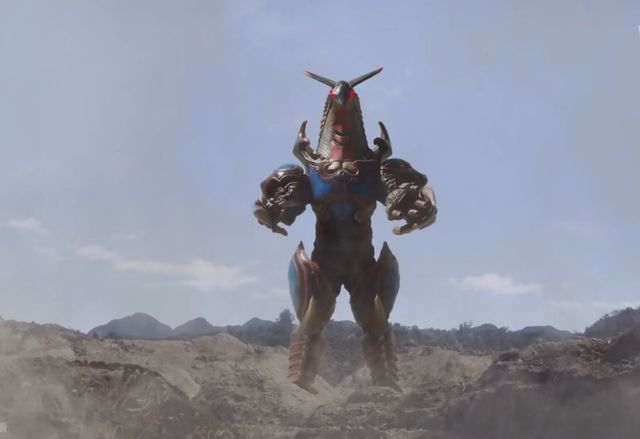 画面中,一个巨大的机器人怪兽正在降落,马上快要接近地面的时候突然一阵红光亮起,是奈克瑟斯接住了机器人将他撞飞到地面上。