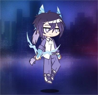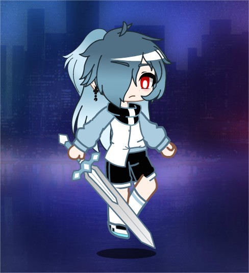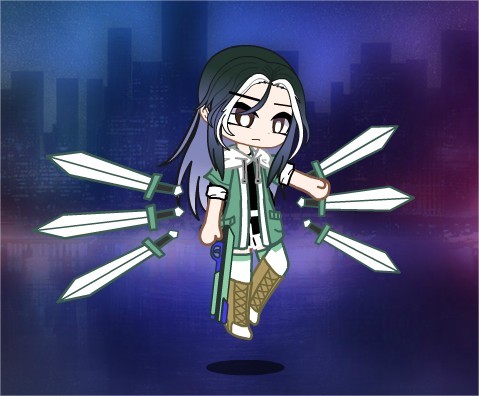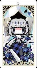 卡牌化:深蓝色头发长到腰部,颜色从上到下渐变成白,有一把可以斩断一切的剑,能砍出风刃,可以召唤一个巨大的银色骑士
