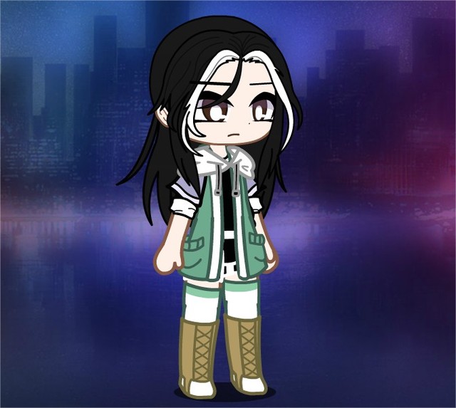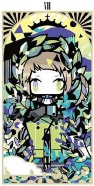 卡牌化:深绿色过肩长发长到小腿部分,颜色从上到下渐变成白,蓝色过渡,有一把无限子弹的手枪,可召唤手雷、枪、坦克等武器