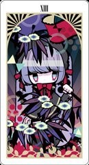 卡牌化:深紫色头发长到腰部,颜色从上到下渐变成白,浅棕色过渡,有一把黑红色的巨大镰刀,能力可召唤幽灵(或称为鬼魂)辅助产生精神物理双重伤害,有吸血鬼的特征(皮肤有些病态的白)但不惧怕阳光,不喝血