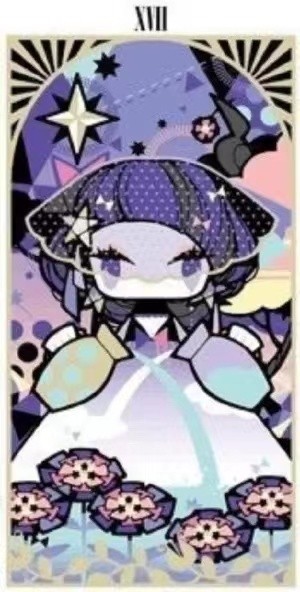 卡牌化:暗紫色头发从上到下渐变成白,头发长到腰部成麻花辫,头上两颗星星发饰变成冰,手背上出现冰块,左手背上形成小型冰弓,可射出冰箭,穿透力很强,甚至可以形成机关枪(详情请在b站看《穿透幻影的太阳》里星罗圣河的用法)