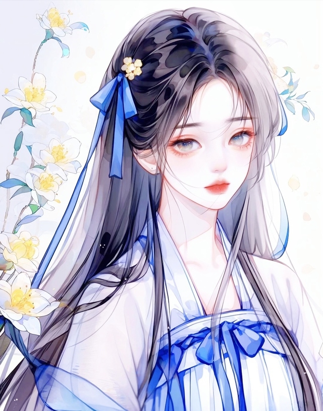 时光荏苒,若初的秀发如诗如画,犹如一挂流泻的墨玉瀑布,轻柔地垂覆在她的肩头,每一丝都闪烁着月光般的光泽。她那精致的脸庞,宛如精心雕琢的艺术品,小巧而生动,仿佛藏着星辰的秘密。身着一袭深邃的蓝,古韵盎然的服饰更衬托出她的娴雅宁静。
