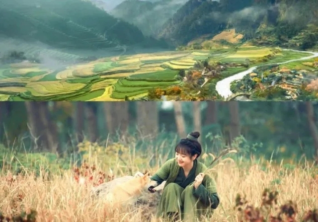 她穿着一身绿色麻布长裙,正蹲在药田中与一只灵犬嬉戏。