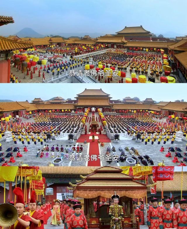 翌日午时,皇上率文武百官,皇亲国戚及各宫嫔妃,阿哥格格在太和殿前静候老佛爷的队伍。