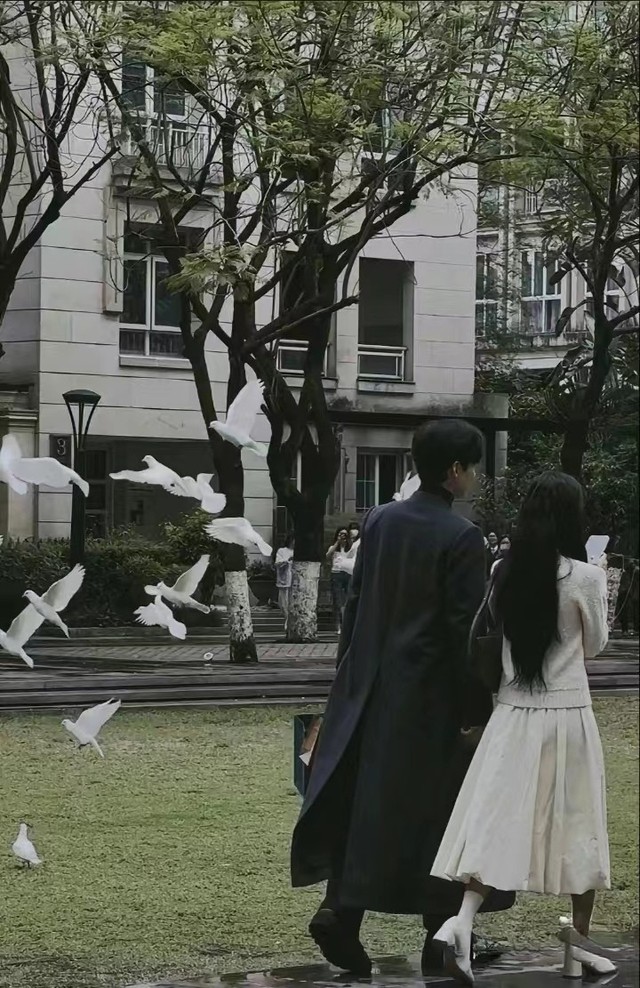他们手牵手走出复式楼,来到广场。远处的白鸽正在觅食,他们成群结队的飞入空中。