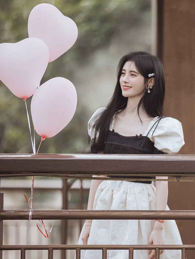 叶卿妤站在户外的平台上,手中轻握着三颗粉色的心形气球,嘴角不自觉地扬起一抹微笑。