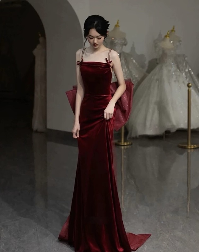 丁若瑶穿着一袭暗红色吊带裙装,裙子散发出丝绸的质感,白皙的锁骨露出,头发慵懒的扎着,贴身的礼服勾勒出她完美的身材,背后的蝴蝶结身为点睛之笔,看起来高贵而优雅