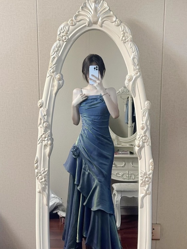 于雅茹穿着一条蓝色长裙,衣服上点缀的两朵同色系花朵显得她大气而温柔,裙摆的褶皱更将她凹凸有致的身材展现了出来
