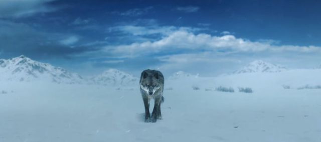 巨狼被一条绳子绊倒,一个身穿白蓝相渐的汉服从天而降手拿一把剑直戳狼的咽喉