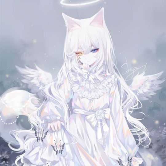 少女睡在紫色的大床上,头发上的两只狐狸耳朵显得她更加可爱,一身洁白的长发披在衣裙,睁开黄蓝异瞳,提着白白的裙摆站起来穿上紫色裙子。