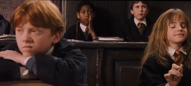 魔咒课上,弗利维教授站在高高的书堆上手舞足蹈的讲着咒语技巧,然后给每两人颁发了一根羽毛
