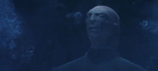奇洛只好无奈地开始解缠头巾,缠头巾被解开一张灰白像蛇一样的脸从奇洛的后脑露了出来,哈利手脚冰凉吓得呆住了,加布里埃看着那张脸也觉得有些恶心,她想过伏地魔很虚弱但没想到需要寄生在他人后脑上,还这么恶心