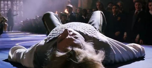 斯内普的魔杖顶端射出一道强光打在对面还在摆造型的洛哈特身上,洛哈特被重重击飞,倒在地上