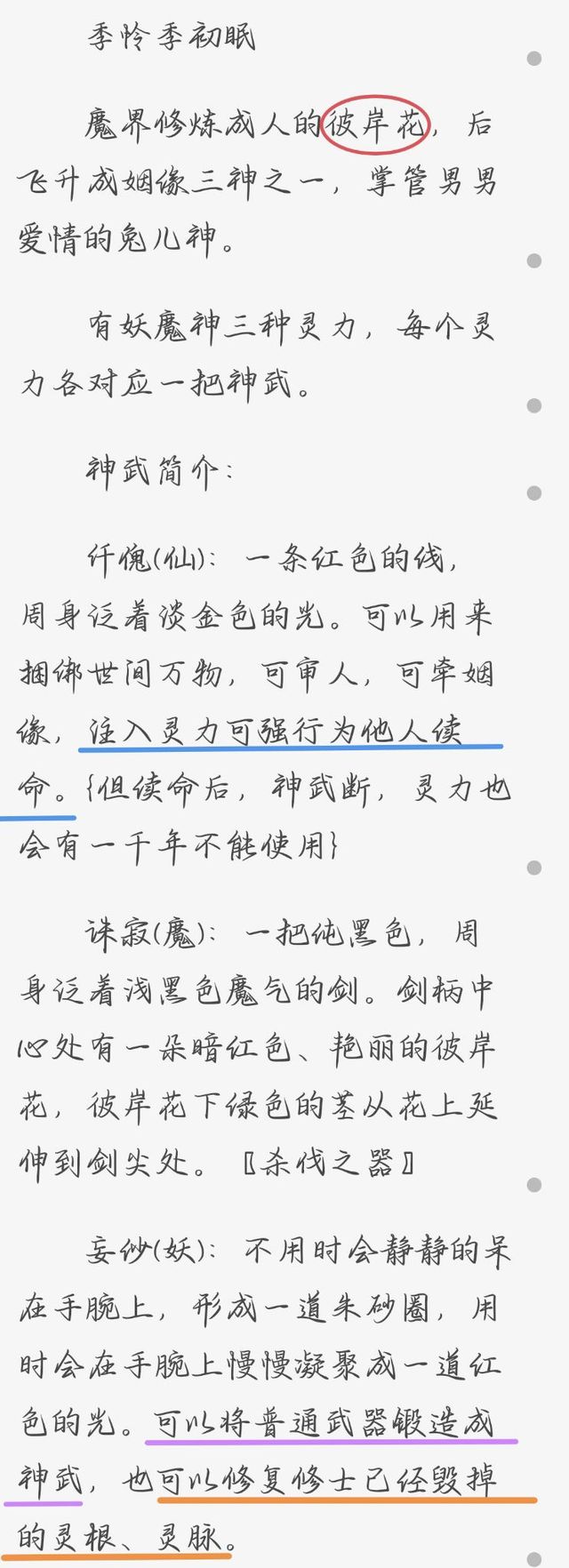 “注入灵力可强行为他人续命。”这是我用蓝色马克笔勾起来的一行字。