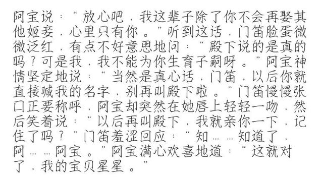阿宝说:“放心吧,我这辈子除了你不会再娶其他姬妾,心里只有你。”听到这话,门笛脸蛋微微泛红,有点不好意思地问:“殿下说的是真的吗?可是我,我不能为你生育子嗣呀。”阿宝神情坚定地说:“当然是真心话,门笛,以后你就直接喊我的名字,别再叫殿下啦。”门笛慢慢张口正要称呼,阿宝却突然在她唇上轻轻一吻,然后笑着说:“以后再叫殿下,我就亲你一下,记住了吗?”门笛羞涩回应:“知……知道了,阿……阿宝。”阿宝满心欢喜地道:“这就对了,我的宝贝星星。”