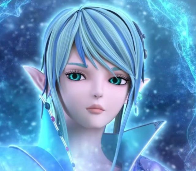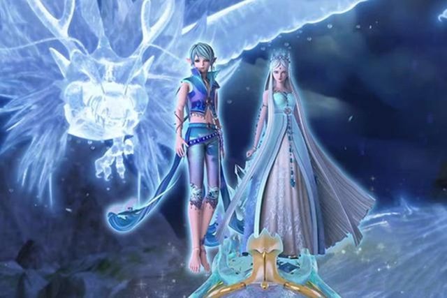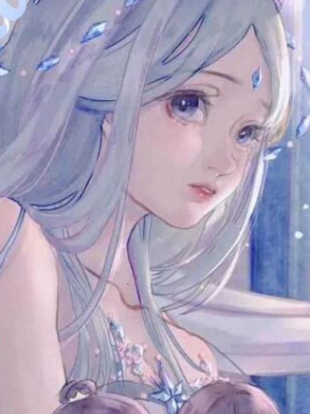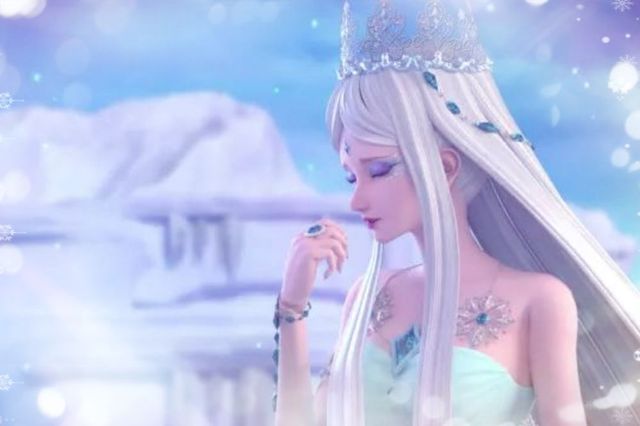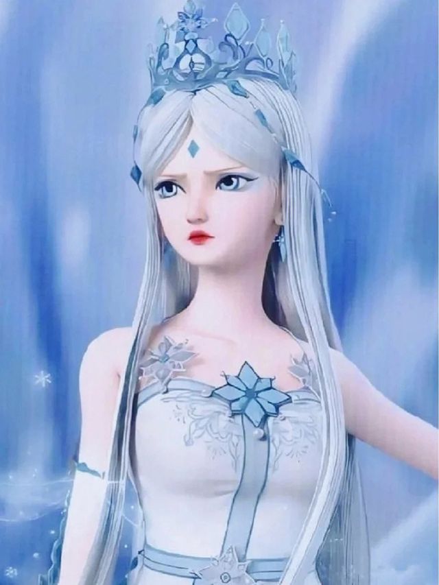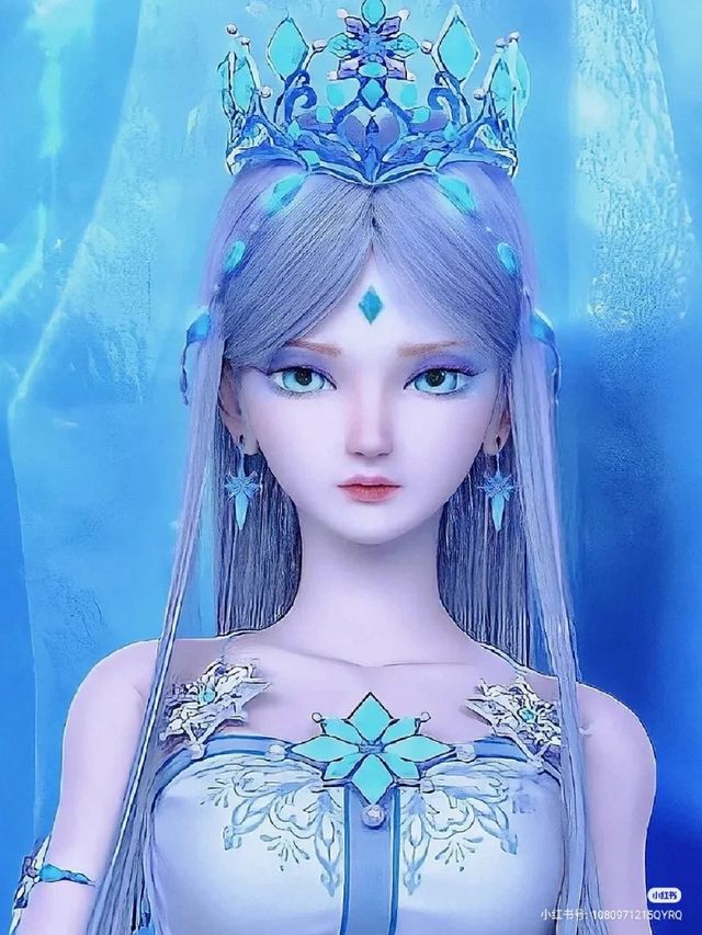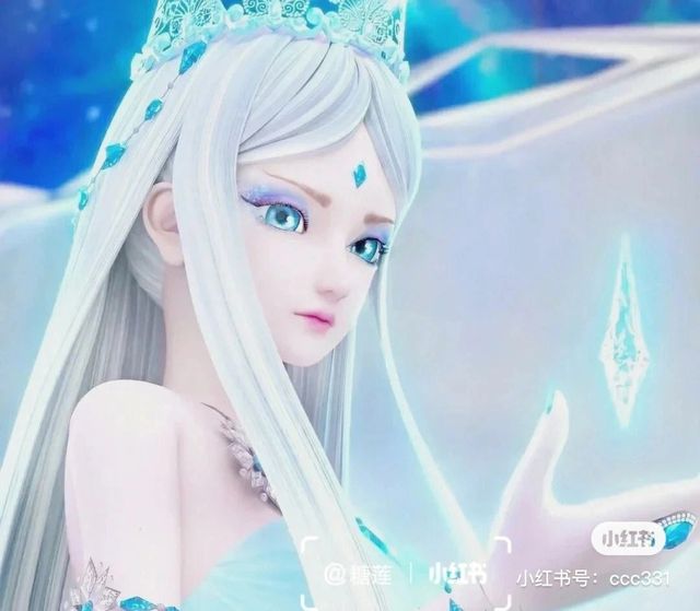 长裙内层为半透明镂空花纹,脚踏水晶鞋,双眸是湛蓝色,额中央镶嵌冰蓝色菱形冰晶。闪着荧光的银白色长发,在身后笔直垂至足踝,上面挂着冰晶链,灵动而清丽。发端戴着镂空晶蓝色的王冠,彰显着其尊贵的身份