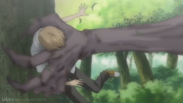 夏目没有理会妖怪的话,继续用全力奔跑着,当距离神社门口不过直尺的距离,却突然被妖怪伸长的手拍到树上。
