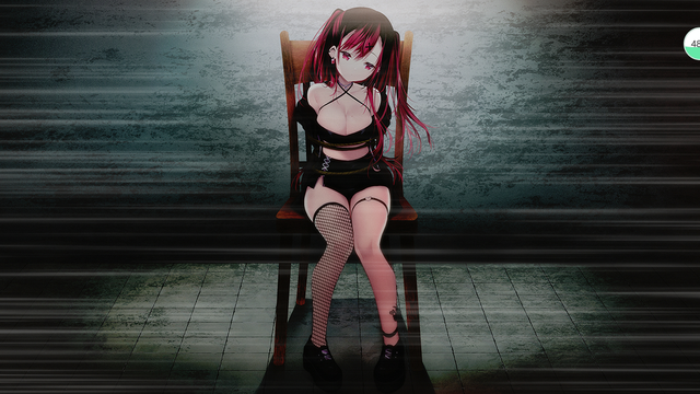 露比被全身束缚,坐在深棕色的椅子上