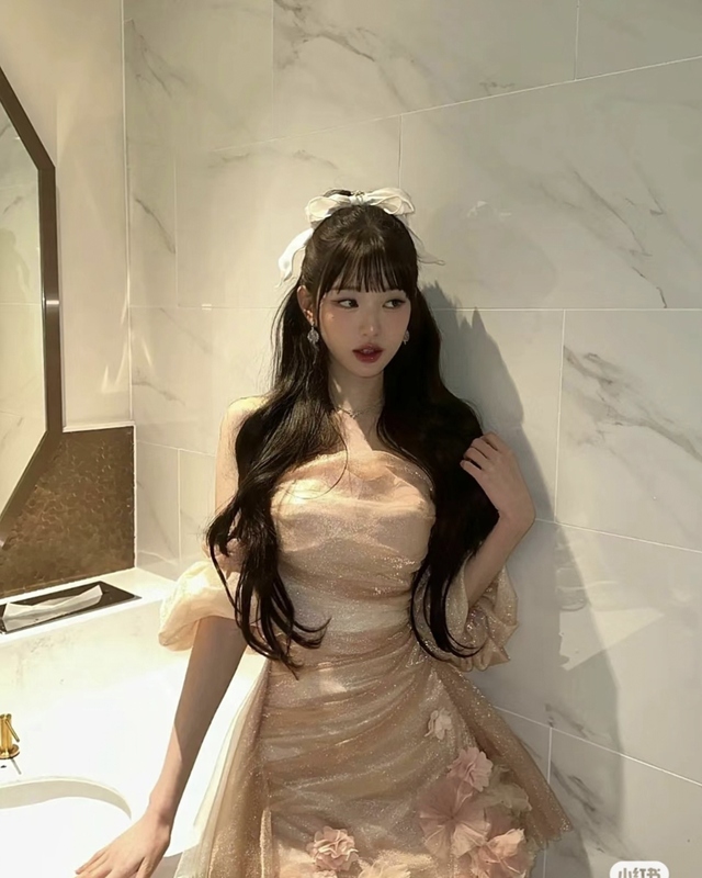 礼服淡淡的粉色配着花花,裙身不长,盖住大腿多一点,还留着两天垂尾,将姣好的身材呈现的恰到好处,泡泡袖的设计深得朱黎喜欢,整个少女感十足