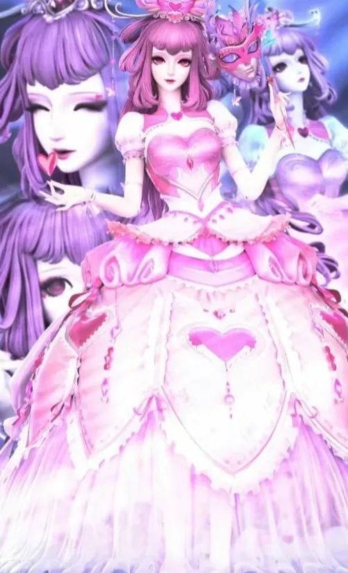 有着烟粉色的头发,身着粉色的克里诺林裙,头戴粉色的头冠,脚踏有爱心图案的粉色松糕鞋。左手小拇指带着一个粉色的爱心钻戒。