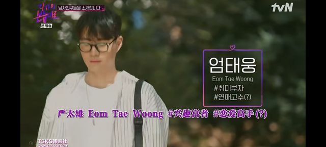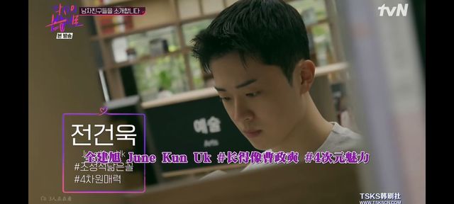 金颖窈面前站着一名戴着黑框眼镜, 穿着白色条纹衬衣,看起来很像模特的男生;两人开朗大方的打着招呼,看起来心情都不错。