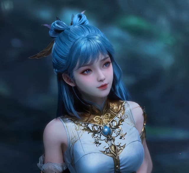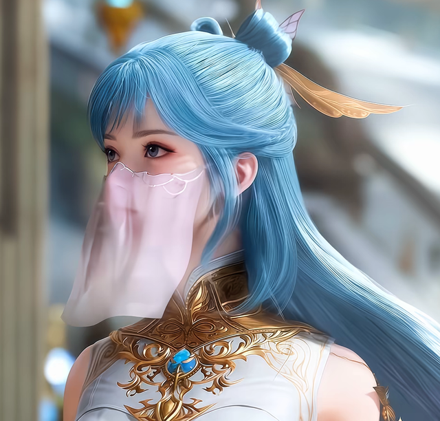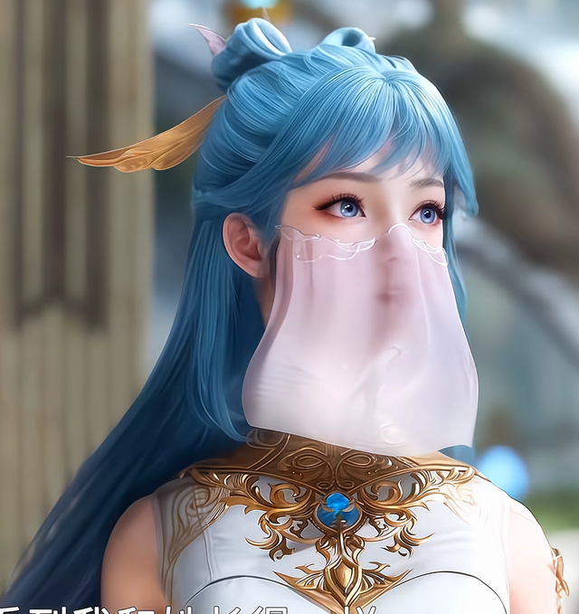 不远处高上一个带面纱少女看着拥有一头粉蓝色的长发,眼睛清澈明亮,眼型适中,眼神灵动俏皮。她的嘴唇红润小巧,唇形优美,增添了几分娇艳欲滴的美感。她的脸型是瓜子脸,轮廓线条流畅,下巴小巧精致,给人一种甜美可爱的感觉