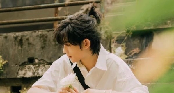 余宇涵把自己的头发聚在头顶扎了一个啾啾,整颗头就像一个苹果,露出他精致立体的眉眼。
