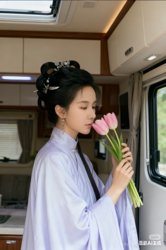 而在熙熙和瑶瑶眼中,只见陈姝禾身着一袭素雅长裙,如瀑的发丝轻挽,手持一束娇艳的粉色郁金香,微微俯身,将鼻尖凑近那馥郁的花香,眼眸轻阖,似在享受这片刻的芬芳与宁静。