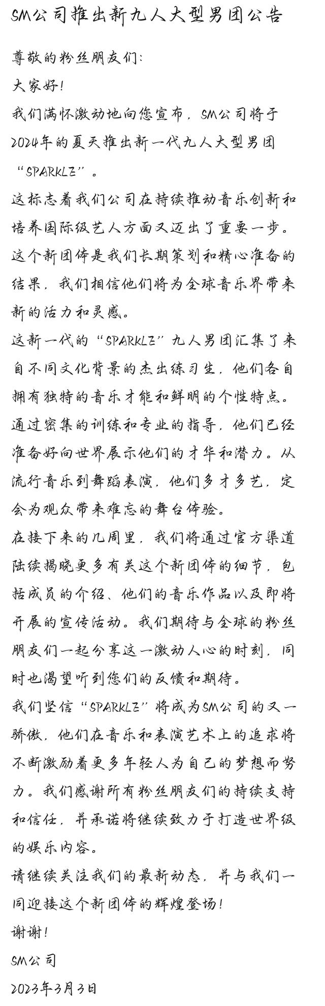 不靠谱的作者附一份SM公司推出九人大型男团的公告。