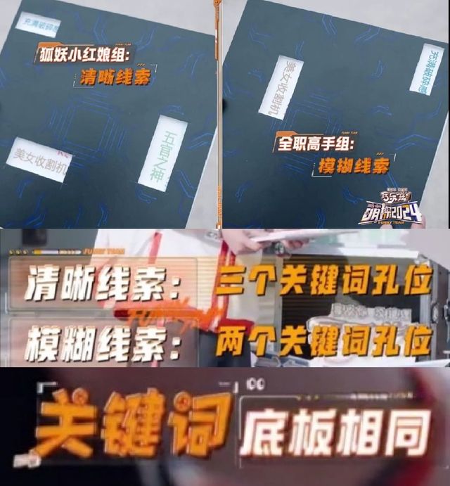 拿到线索后,全职高手根据两个关键词孔位,经过旋转对位得出了几个关键词:被封恋爱脑、爱而不得、少女理想型、彩虹屁机器、充满破碎感,美女收割机,心直口快,从业已久。而另一边的狐妖小红娘队得到的关键词为:恋爱圣手,少女理想型,彩虹屁机器,充满破碎感,五官之神,美女收割机,爱而不得,被封恋爱脑,不能输的人,心直口快,从业已久,内娱活人