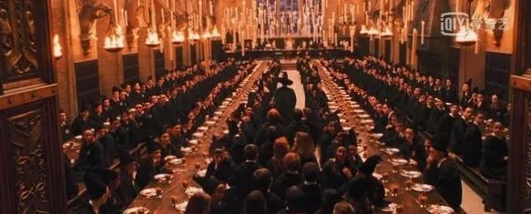 礼堂内部非常气派。这是四张长桌,对应着四个学院。桌子上方悬浮着一百多支蜡烛,桌子旁边还有许多身体是透明的幽灵。