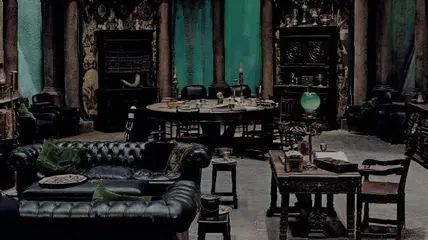 我们的公共休息室内部部置非常气派。从顶置的窗户可以看见有绿色的光和湖底生物的影子照进来。