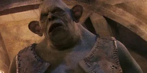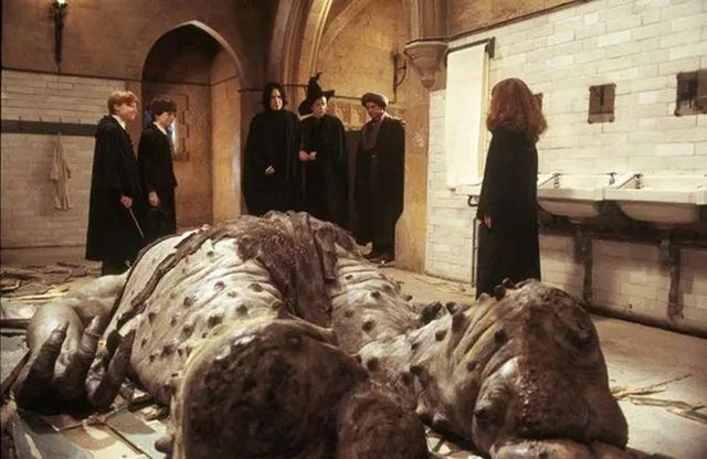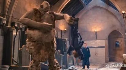 巨怪被罗恩的声音吸引过去,当然也被激怒了。现在,它的目标变成了哈利和罗恩。哈利在这个时候跳到了巨怪的背上,爬上了它的脑袋。
