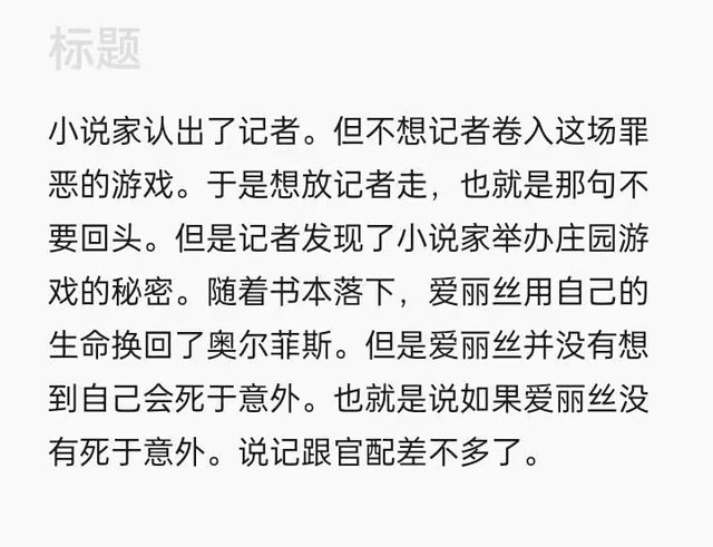 他已经把他最爱的夜莺杀了。在噩梦出来的时候他凭靠着最后的意志,叫爱丽丝不要回头,因为回头就是噩梦。但是她还是回头了,因为她从声音里就知道是奥菲,就知道是他,她想如果不回头那么可能一辈子见不到他了,所以她回头了。因为那场火,庄园的一切和真相都被掩埋在灰烬里,而爱丽丝被困在乐土里,只有他,只有奥菲活了下来,但他和爱丽丝一样失去了记忆,只有一些影子在脑海里时隐时现妄图让他回忆起以前。他收到了噩梦的信,再次踏进这座庄园,再次将灰烬扫除,将一切和真相公开于世。可惜他和爱丽丝一样,在真相出现时就已经被困在那了。(以上为复制)