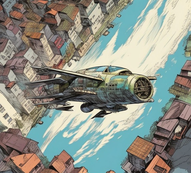 就在两人即将取得胜利的时候,一声巨大的轰鸣声从天空传来。只见一架巨大的飞行器出现在天空中,朝着城镇俯冲而下。