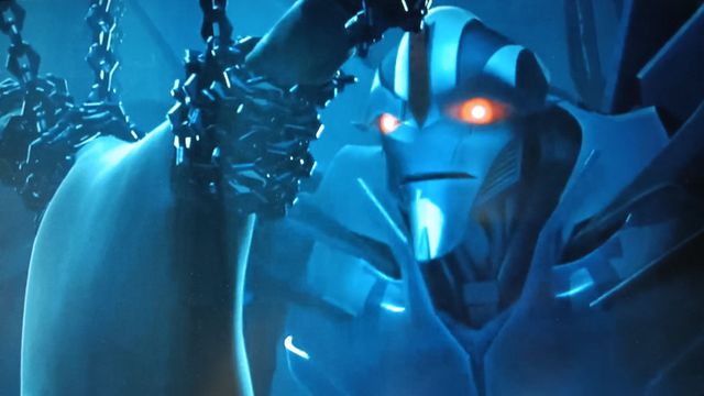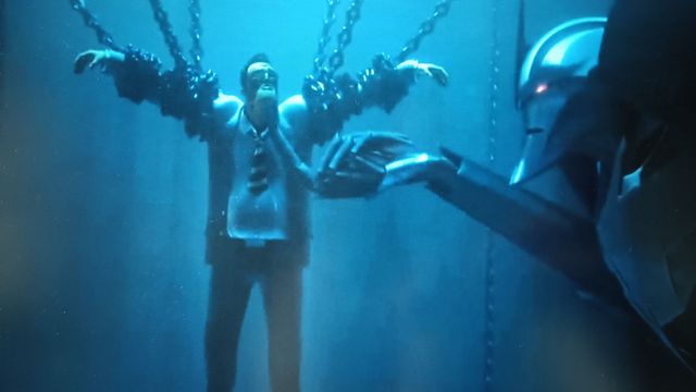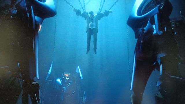 富勒特工被铁链束缚,悬于半空之中,四周有三名霸天虎如影随形地守护着。