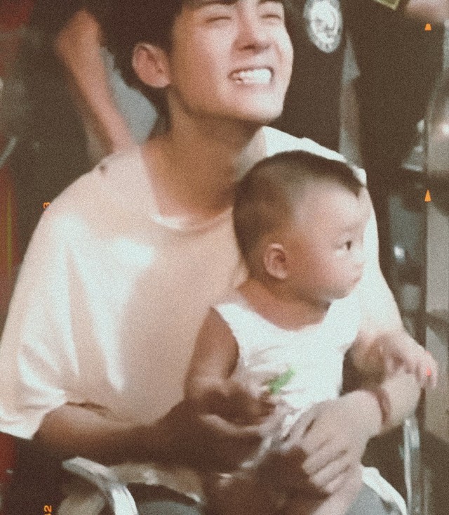 他抱着好奇宝宝吴晟(小太阳),老婆抱可爱小天使吴曦(小月亮)一家人在天井里纳凉,说着有意思的事~