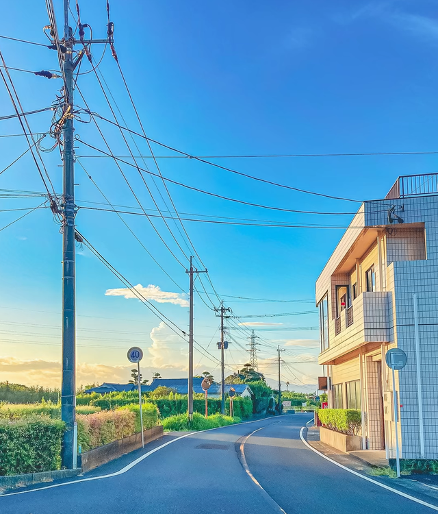 一处静谧的乡间小径,沐浴在明亮的日光下,宛如一幅宁静的诗篇。小路在繁茂的绿色怀抱中蜿蜒伸展,穿越过如画的田野,远方是层峦叠嶂的山丘和满目翠绿的林带。近处,路面的白色斑纹勾勒出这条通往宁静的通道,仿佛在诉说着村落的故事。然而,天空中错综复杂的电线网络打破了这份宁静,它们如同音符般在蔚蓝之上跃动,给这自然的画卷添上了一抹现代的旋律。路边,一块蓝色的交通标志牌矗立,其上的“40”和圆形符号静静地提醒着过往的行人,这是个生活与速度并存的天地。这个场景,尽管有人工的痕迹,却依然散发着一种宁静的和谐,是自然与文明相依相偎的完美写照