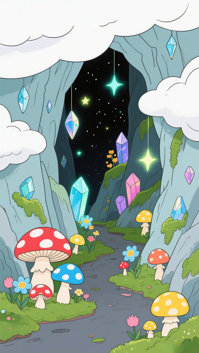 他们进入云朵山洞,洞里有七彩蘑菇、荧光花、发光的苔藓,还有各种各样的水晶