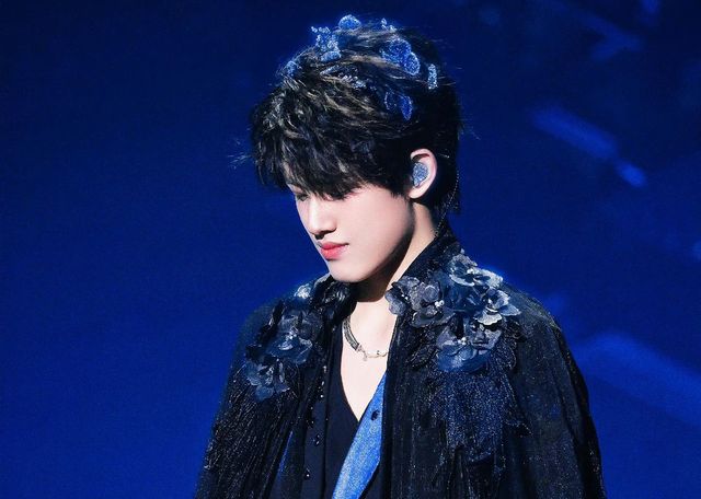 全场被黑暗包围,音乐慢慢递进,从天而降的聚光灯打在缓缓走出舞台的男孩身上,黑篮色妆造与舞台设计,显得忧郁清冷