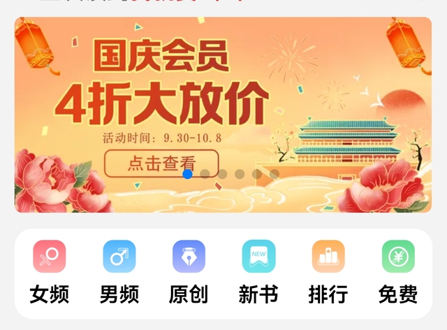 Author首先在进入应用程序后会看到首页上面有大幅的书籍推荐之类的(?)在那里滑动直到看到国庆的通知……?点进去就行了!