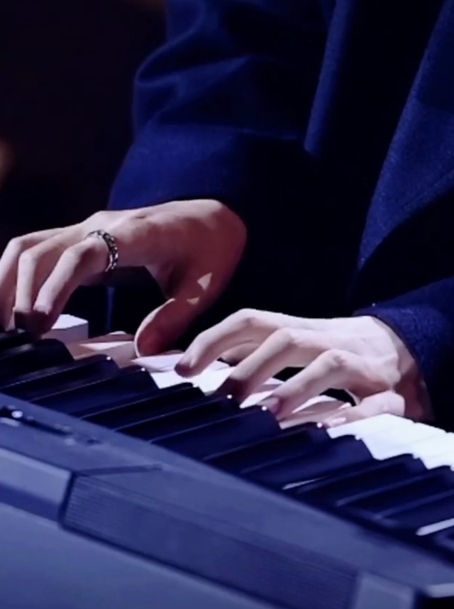 马嘉祺穿着黑色的西服,银框眼镜在阳光的映照下闪烁着点点光芒,光线地洒在他的面庞上,纤细的手指轻轻按动着琴键,低垂的眼眸里倒映出黑白琴键的韵律。