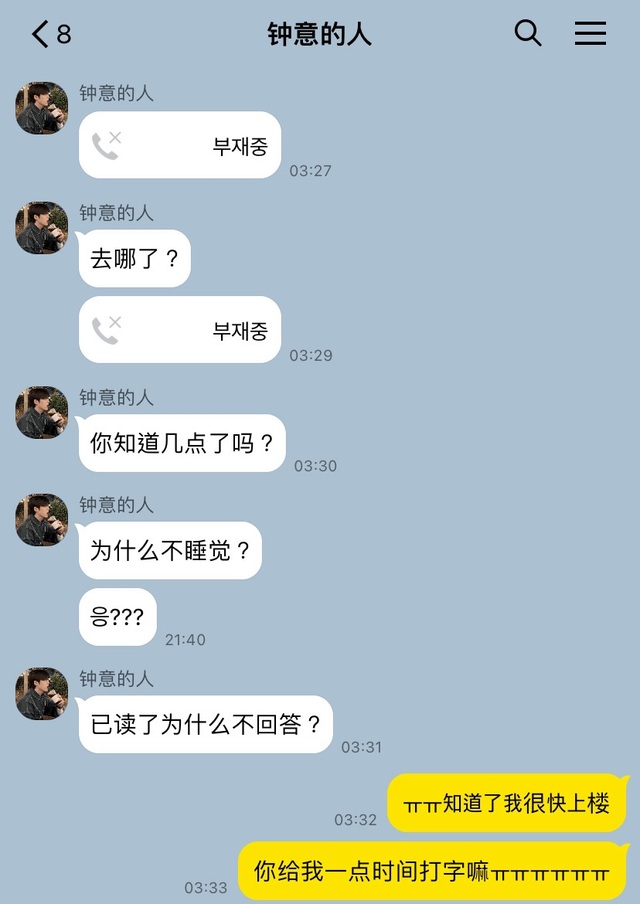 因为夫胜宽的这句话我带着侥幸的心情打开手机,发现崔胜澈真的在找我,我和他们两道别,赶紧冲上楼