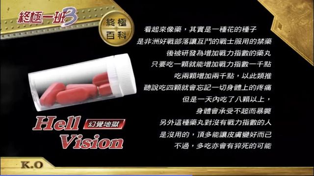 【Hell Vision:看起来像药,其实是一种花的种子,是非洲好戴部落让互斗的战士服用的禁药,后被研发增加战力指数的药丸。只要吃一颗就能增加战力指数一千点,吃两颗增加两千点,以此类推。听说吃四颗就会忘记一切身体上的疼痛,但是一天内吃了八颗以上,身体会承受不起而暴毙。另外,这种药丸对没有战力指数的人是没用的,顶多能让皮肤变好而已。不过,多吃亦会有猝死的可能。】
