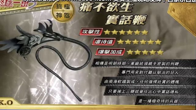 【痛不欲生实话鞭:相传是明朝时期,东厂统领亲手密制的刑鞭,专门用来对付难以驯治的狂人。由南海软铁制成,任何强悍壮实的体魄只要挨上三鞭,就会吐出心中实话隐私,是一种极奇特的兵器。】